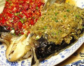 分别将剁椒和佐料拌匀,盖在鱼头的两边,放入蒸锅,大火蒸10分钟,最后倒掉一些汤汁,淋入热油即可。