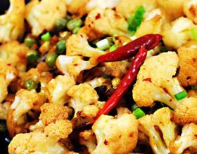 然后放入焯好的菜花翻炒,撒入适量盐即可出锅。