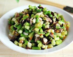 番茄切丁,蒜薹切丁、木耳切丁、猪肉切丁。