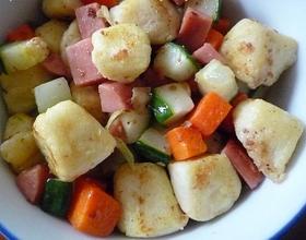 蒜苗头,黄瓜丁,胡萝卜丁,火腿丁。