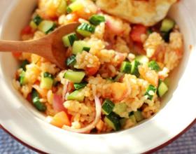放入调制好的酱料2,并炒均匀,让米粒上都占好酱料。