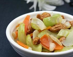 锅内留一半的油,倒入胡萝卜、西芹,大火翻炒1分钟左右。