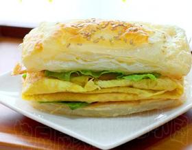 - 8. 再将另一片培根和生菜叶放在蛋皮上,最后放上另一半饼皮就可以了。