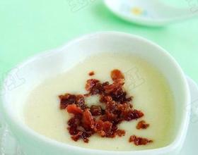 - 7. 把土豆泥放入锅内,加适量牛奶煮开,放入盐和黑胡椒粉,搅拌均匀即可,喝的时候放煎好的培根碎,非常非常香哈。
