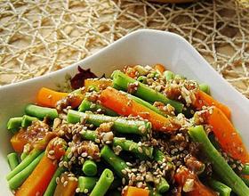 将调味汁倒在豆角、胡萝卜中,洒上白芝麻装盘即可。