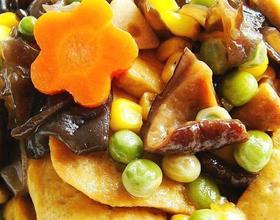 起锅,放葱,炒出香味后,将(香菇豌豆玉米胡萝卜)和木耳入锅煸炒一下。