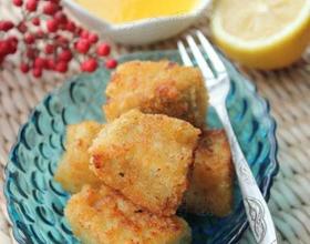 - 5. 将所有的鳕鱼块按照上面的步骤裹好面粉,蛋液,面包糠备用。平底锅,加入适量食用油,小火加热,之后放入鳕鱼块,小火慢煎。