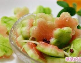 1.瓜瓤略修齐即可,带着点儿粉红的瓜瓤配绿色瓜皮才好看。