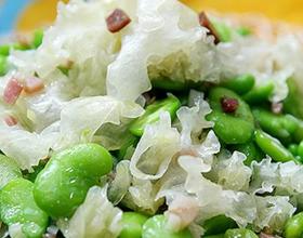 倒入银耳、糖、两汤匙的水,同时翻炒,目的是使火腿中的鲜味能通过水与其他材料进行。很好的融合。两三分钟后看锅内汤汁变少,按口味加盐关火。