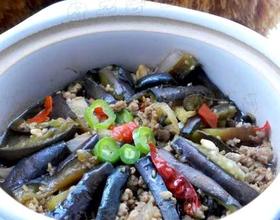 转入陶瓷煲中;盖上盖中小火焖煮5-6分钟至茄条入味,吃前淋少许芝麻油即可。