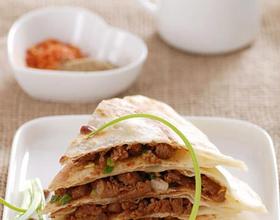 铺一张烙好的薄饼,加入一半肉,摊平,边缘刷一层面糊。