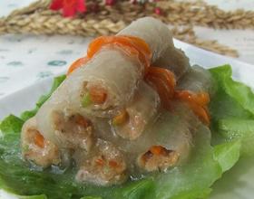 将冬瓜片从一端卷到另一端,然后用胡萝卜条将冬瓜卷捆起来。