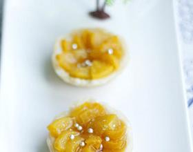将面团用两个大拇指在模具中捏成挞皮,摆入黄桃片。放入预热好的烤箱中层,220度,烤15分钟。