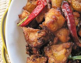 锅里烧油至7层热,倒入姜蒜炒出香味后倒入干辣椒和花椒,翻炒至气味开始呛鼻,油变黄后倒入炸好的鸡块,炒至鸡块均匀地分布在辣椒中后撒入葱段、鸡精、白糖,炒匀后起锅即可.