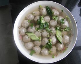 用左手抓一把肉泥、用虎口挤出,用右手打母指挑入锅内。
