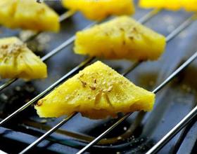 烤菠萝应选择九成熟的新鲜菠萝。菠萝皮较其它水果皮难削,那层鱼鳞似的厚厚果皮和满身的尖刺常让买者望而却步,所以这种削菠萝皮的活计我们一般都请果贩代劳。请人代削菠萝皮虽然便利,但在卫生方面难尽人意。果贩的那把水果刀工作频率太高,极少能及时清洗,而且削好皮的菠萝肉要裸露在外一段时间,难免染上细菌脏物,假若想吃上干净卫生的菠萝,最好还是自己亲自动手削皮。
