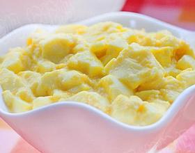 煎锅倒少量油,小火加热,倒入咸蛋黄泥。