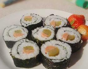 酸黄瓜本身酸味十足所以米饭里没有另拌上寿司醋,米饭铺在紫菜上时要一边薄一边厚,这样卷的时候才容易沾连。