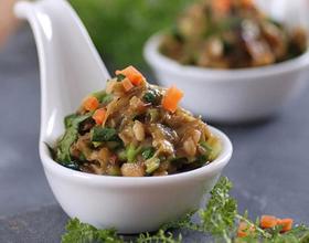 这道菜的关键在于要把烤好的辣椒碾碎成泥,如果方便,可以把香菜香葱同样都碾一下,味道会更好。