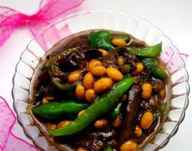- 13. 茄子和黄豆熟了,放入切好的青椒丝、盐适量翻炒至收浓汤,滴少许香油,鸡精少许,即可出锅。
