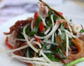 - 1. 材料的处理:鲜鱿鱼撕掉外皮和去掉内脏,切花刀后改成一寸见方的小块;叉烧切丝、虾米提前泡发、豆芽洗净和韭菜、红椒切成一样的长短,准备好姜丝和蒜片。