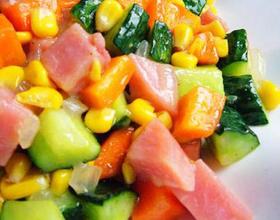 放入黄瓜丁略炒,最后放玉米粒、火腿丁。