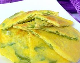 慢慢倒入鸭蛋液,让其自然在锅内流动盖住苦瓜片;小火慢煎,等蛋饼周边松动并离开锅底立即翻煎另一面,直至饼两面金黄即可。