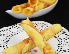 6,在用平底锅烙的全程中,都要保持文火,以免火力太高,面糊入平底锅加速凝固,面皮太厚,蛋卷不薄脆。