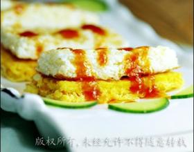 分别将马蹄蛋清液和海米蛋黄液煎成白色和黄色两个蛋饼。