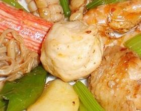 - 1. 蟹棒、鱼丸、蚬子、青虾处理好,备用同时鸡翅用刀剁成块,用水焯一下,去血沫。鱿鱼洗净打花刀,用水焯一下,成鱿鱼卷,蚬子吐净沙后,用水煮一下,去壳。青虾剪去须,挑去肠,用水略煮一下。