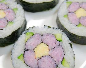- 14. 将刚卷好的花朵放在铺好的米饭的一端。