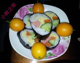 因为是手卷的,不是很紧,所以用了两张海苔,这样卷好的寿司就不会散了。