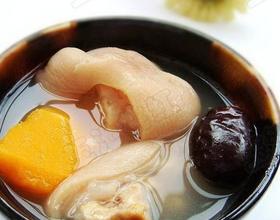 砂锅内放水,将猪蹄和红枣、姜片、小葱一起放进去。大火煮开,如有浮沫,用汤勺将浮沫撇去。