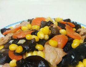准备原料:玉米粒洗干净、黑木耳泡发、胡萝卜切成片、猪肉加点盐、料酒、湿淀粉稍腌。