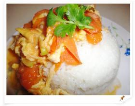 最后,将西红柿鸡蛋浇在刚煮好的米饭上就做好了