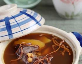 一个半小时后将泡好的虫草花连同泡好的水一同倒入,继续文火炖半小时左右。