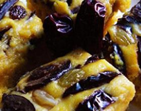 - 4. 大枣几枚,去核,切成丝,与葡萄干均匀地摆放在玉米糊上。