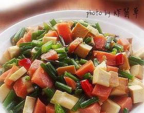 这倒菜可不用放葱,因为韭苔和葱属同一科,不用放水,三种食材都是快熟型的,热油翻炒可使三种食材互相入味。
