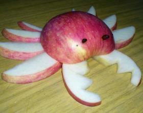 取两个苹果核,插在步骤2中切下的③上,做成螃蟹的身体