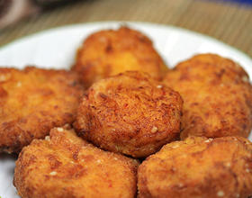 用勺子将南瓜虾茸均匀勺起,表面蘸上生粉,下油锅中火炸至整个成金黄色就行了。