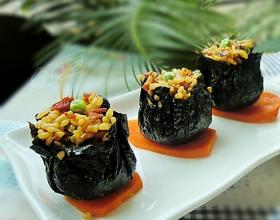 培根已有咸味,加上蚝油的鲜美,所以不用再加盐。要用做寿司的烤紫菜来做皮,这样可以直接食用。也可以用糯米饭来做因为糯米粘性很大,包出来的烧卖会更好看。