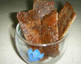 - 13. 烤箱预热,200度上下火,1小时,至变成肉干状即可。期间,15分钟后取出刷一层植物油和蜂蜜汁;再过15分钟后翻面,刷一层蜂蜜汁;最后15分钟时我撒了一些烤鸡翅料,味道很好!喜欢辣味的可撒一些辣椒粉。(烤制时间根据个人烤箱调节。蜂蜜汁=蜂蜜2汤匙 水2汤匙)