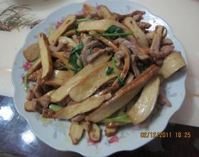 锅里放入一勺植物油,烧热后放入蒜末翻炒后放进肉丝翻炒两分钟