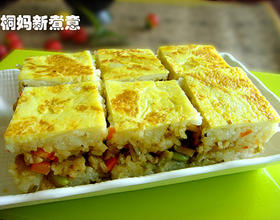 - 14. 再铺上拌好的浇头,用铲子使劲压实,打开饼铛上下开关,盖上盖子焙2分钟即可。