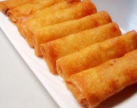 - 17. 锅里放油,将春卷生坯下入旺油锅内炸制。