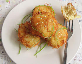 用鸡肉末放在土豆丝上滚成球状。
