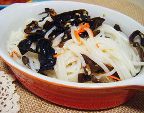 将木耳胡萝卜与米粉混合,加入白糖,白醋,盐,鸡粉,香油和熟芝麻等材料如果喜欢吃辣的,也可以加入韩式辣酱,味道更正宗