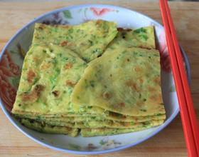 - 5. 待油差不多六七成热的时候往锅里倒入面糊,用铲子将面糊摊平。(若喜欢厚点儿的饼,就不用摊了。)
