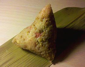 再用米填到边缘处差一点的位置。放太满会漏出来,但放太少包的时候就瘪了,一不好看,二来也容易漏。然后用手捏一个尖角,把上面的叶子盖下来。自己看情况裹好,五花大绑就可以。检查一下几个尖角不漏米就行