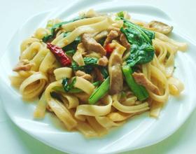拌炒河粉时可一手拿铲子一手拿筷子,这样很容易就拌炒均匀了。炒沙河粉要用猛火快炒,既要炒均匀,手勢又不能太快,因为河粉容易碎掉,油太少的话会黏底炒焦,太多的话又破坏干炒的乾身宗旨,变得油膩。
